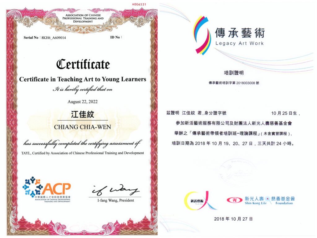 愛文創藝工作室 負責人 | 曼陀羅寶石禪卡創始人 | 曼陀羅禪卡創始人 | 美國禪繞畫認證教師(CZT#23) | 美國 ESTA傳承藝術帶領者 | ACP兒童美術師資認證TAYL | 台北大安扶青社2008-09年團長