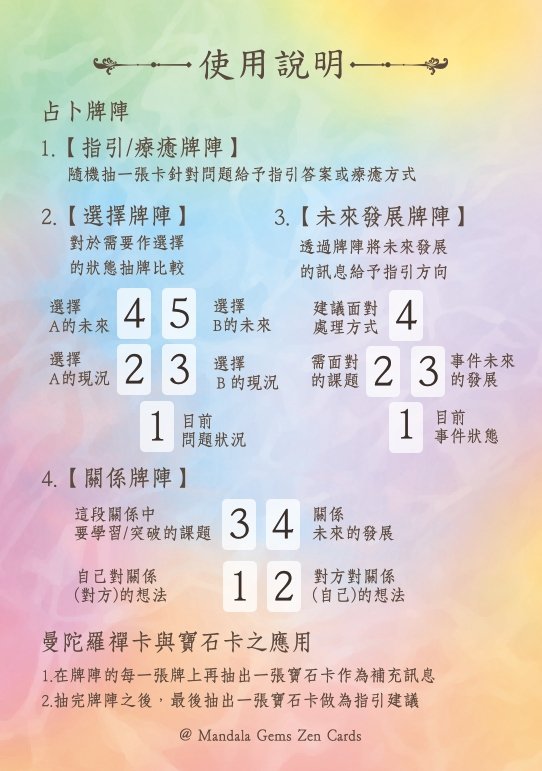 1、在牌陣的每一張牌上再抽出一張寶石卡作為補充訊息 2、抽完牌之後,最後抽出一張寶石卡作為指引建議