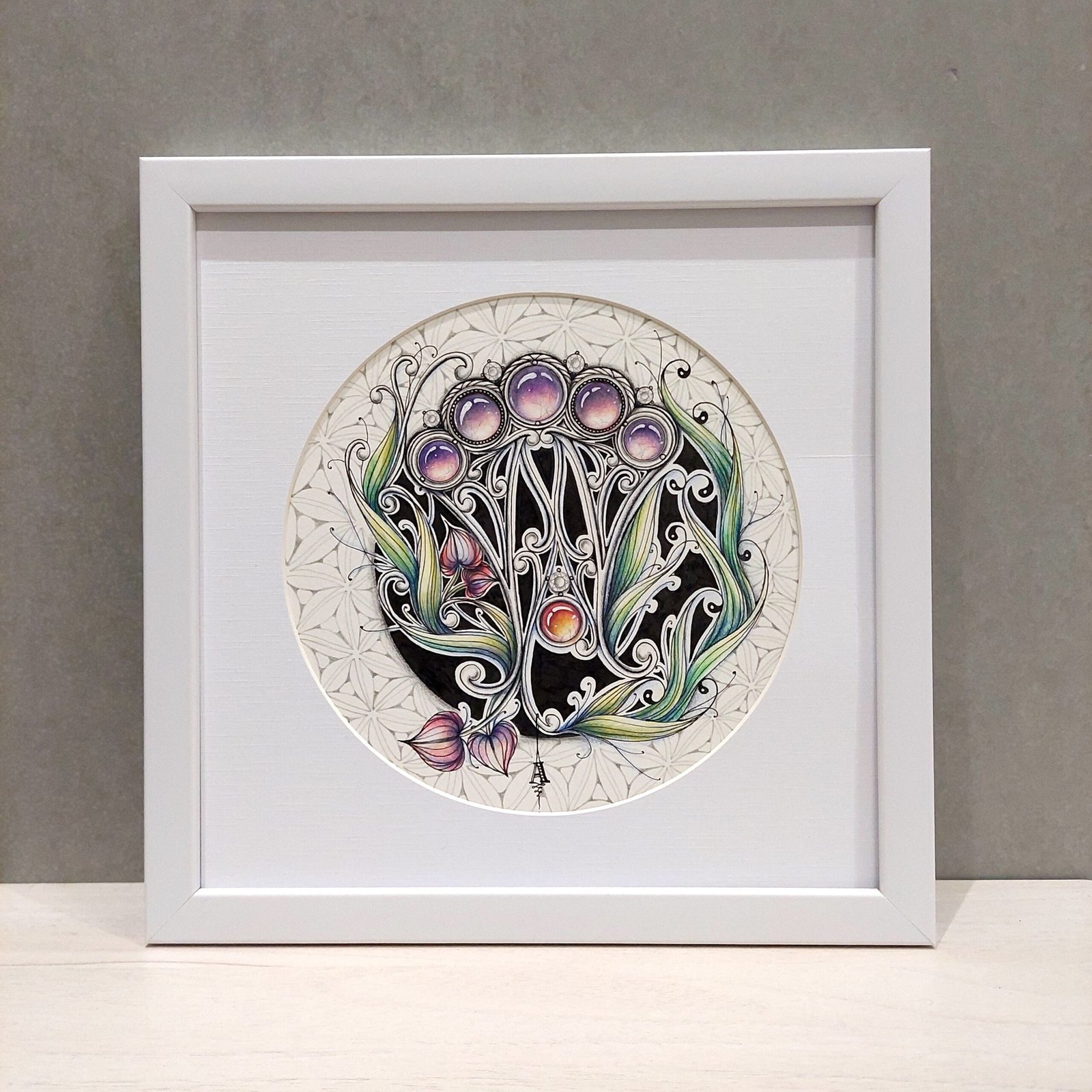 本系列「新藝術風格禪繞寶石」,正是從這樣的美學脈絡出發,將新藝術與慕夏風格中常見的裝飾節奏、曲線結構與自然意象,