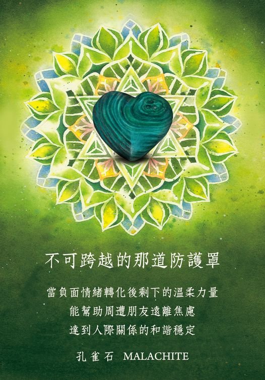 配戴『孔雀石』,陷入痛苦的時候,具有與我們交換能量的溫柔力量。 可以幫我們帶走使我們負面的痛苦的能量和情緒,如陽光驅逐陰霾一般。