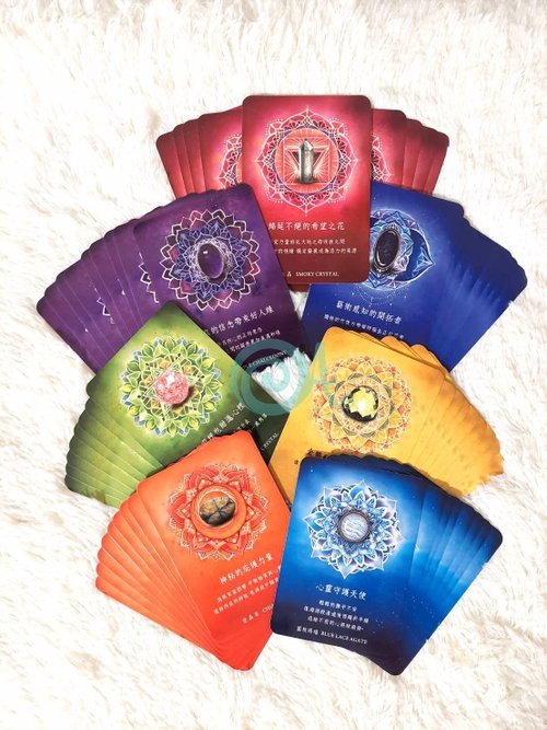 曼陀羅寶石禪卡, 包括 75 張脈輪寶石的卡片,以及7張脈輪卡片, 每張卡片都包含精美的寶石及脈輪手繪圖像。 以簡煉脫俗的文字提供身心靈各方面的指引, 帶給使用者鼓勵、肯定、支持、建議與提醒。